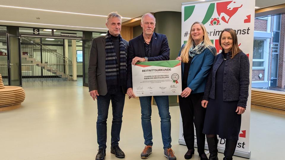 Im Bild: Dr. Peter Petrak, Leiter des Zentrums für schulpraktische Lehrerausbildung (ZfsL) Arnsberg und Mitglied der Koordinierungsgruppe von #sicherimDienst, Ralf Hövelmann, Stabsstelle #sicherimDienst, Iris Litty, Kanzlerin der EvH Bochum und Rektorin Prof. Dr. Dr. Sigrid Graumann (v.l.n.r.).