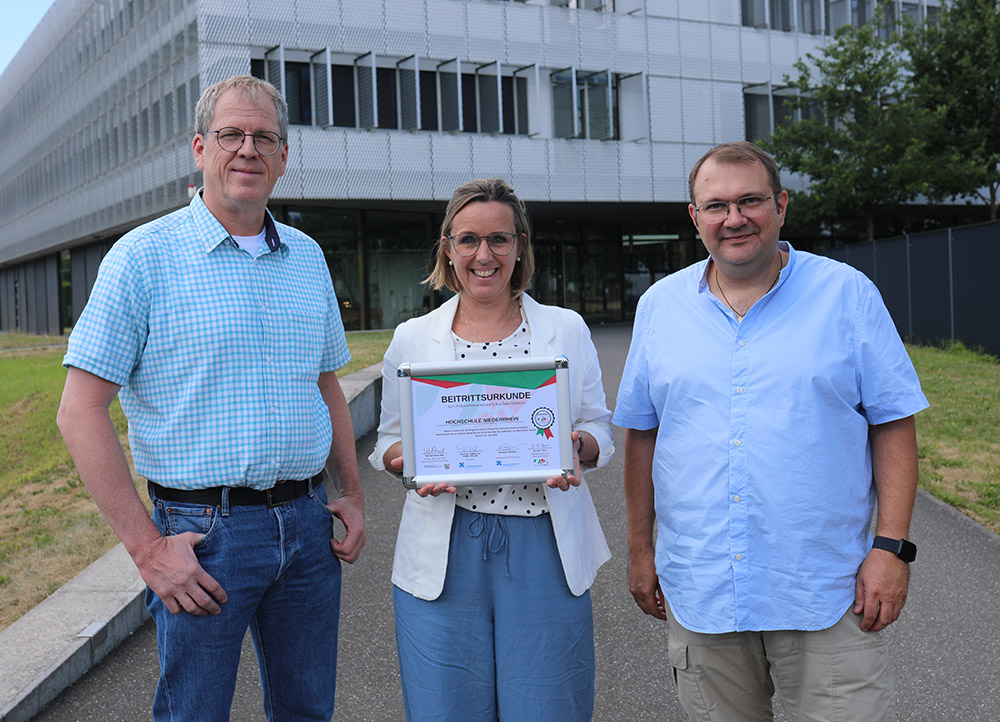 Der Beitritt zum Netzwerk unterstreicht das Engagement der HSNR für die Sicherheit aller Hochschulangehörigen und erweitert die bisherigen Maßnahmen, wie den etablierten Notfallplan und die Push-Benachrichtigungsfunktion der hochschuleigenen iHN-APP bei Krisensituationen.v. l. n. r.