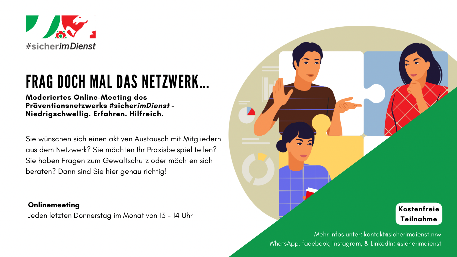 Dieses Format bietet Ihnen Raum für den Dialog! Bei „Frag doch mal das Netzwerk“ steht der niederschwellige Austausch für Netzwerkmitglieder im Mittelpunkt: Bringen Sie Ihre Fragen ein, teilen Sie Praxisbeispiele und treten Sie aktiv mit anderen Netzwerkpartnern in den Austausch – begleitet durch Expertinnen und Experten aus dem jeweiligen Fachgebiet. Ohne vorgegebene Struktur, aber mit viel Raum für Ideen und neue Impulse.