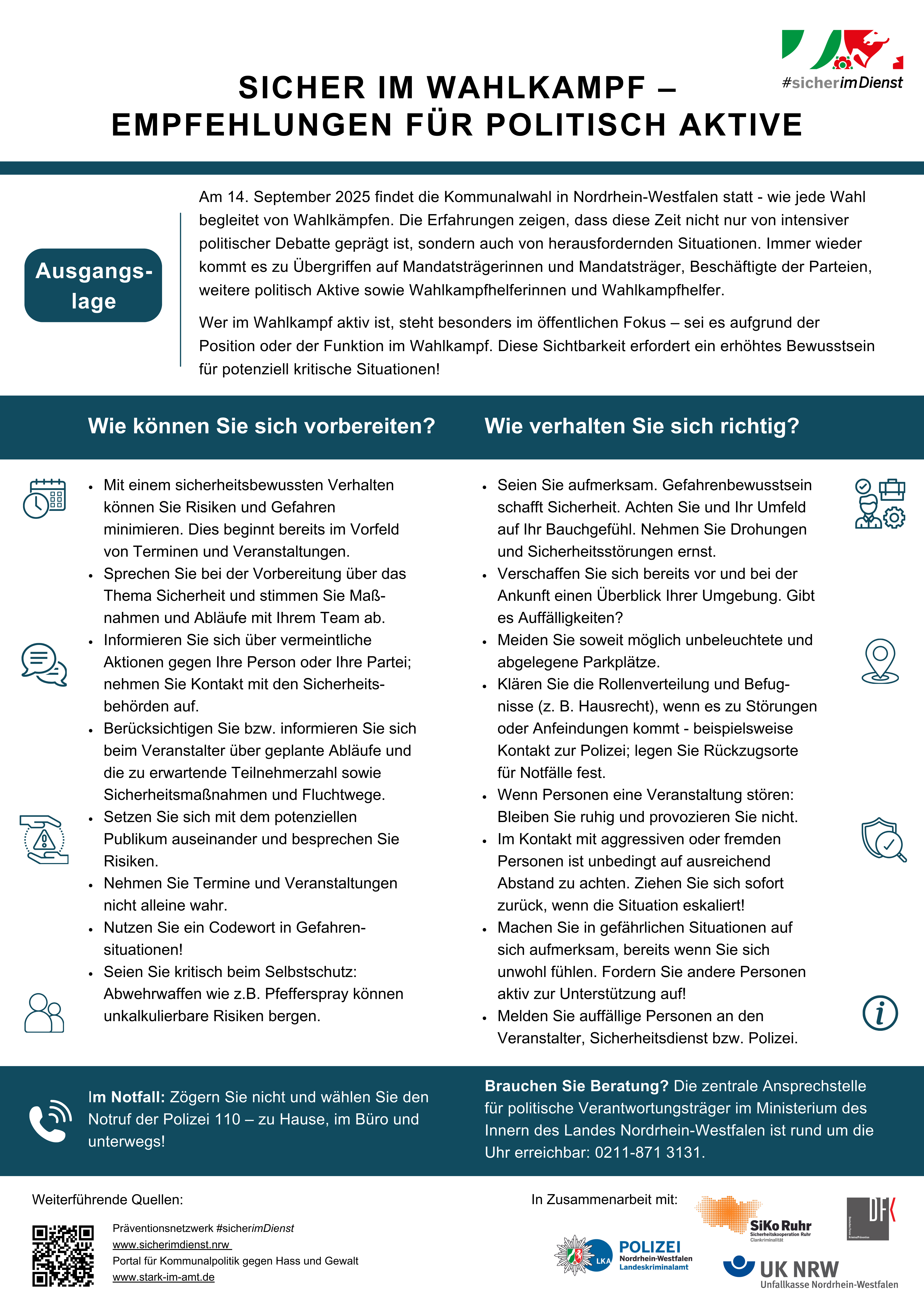 Hier finden Sie unsere Handlungsempfehlungen für einen sicheren Wahlkampf. Gerne beteiligen wir uns – unter Berücksichtigung der Neutralitätspflicht – auch an internen Informationsveranstaltungen zum Thema Gewaltschutz. Sprechen Sie uns bei Interesse gerne an.
