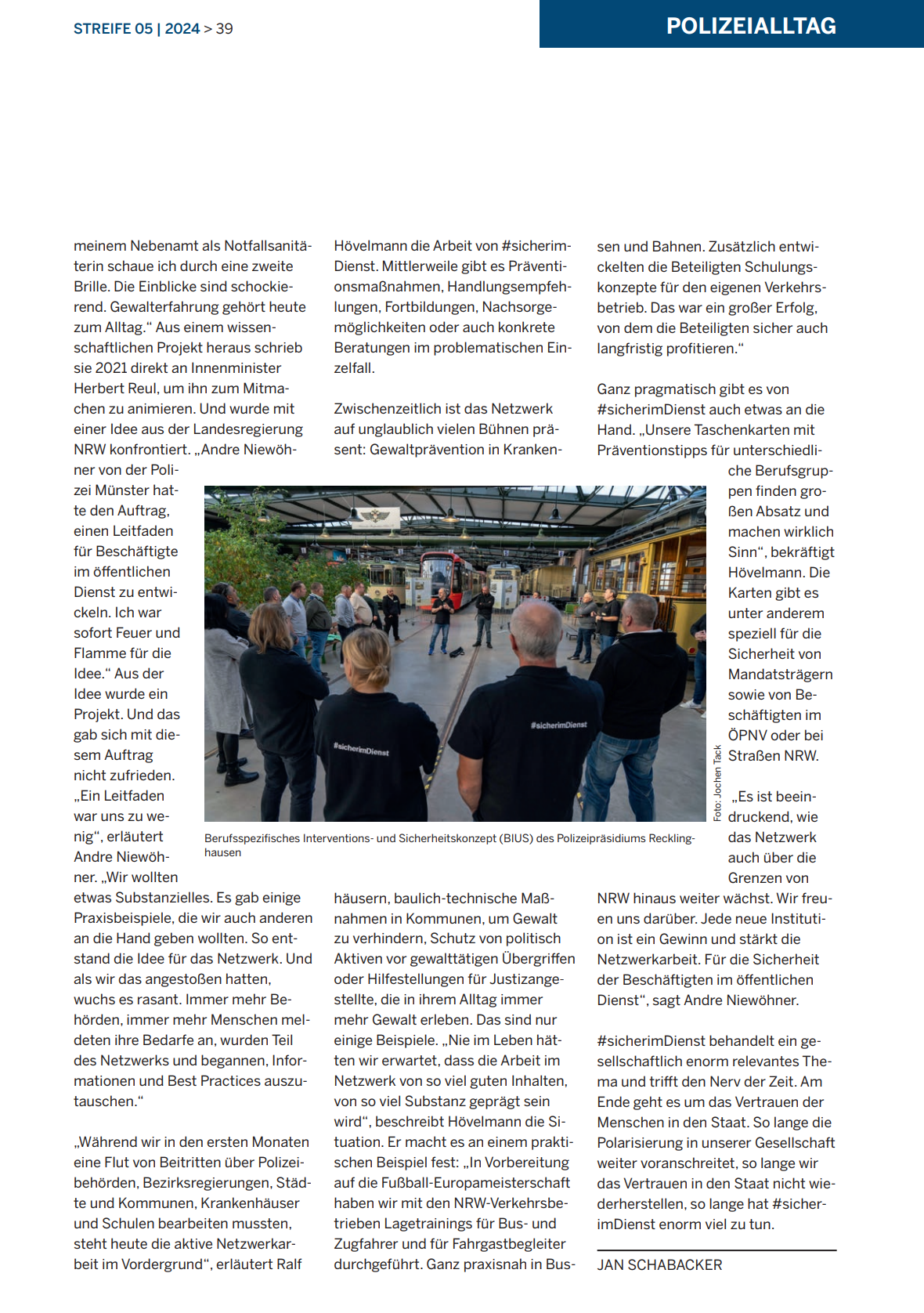 Wie immer geht’s um Menschen in der Organisation und ihre alltägliche Arbeit, „Bb Sie als Taucher im See oder als Streifenpolizistin auf der Autobahn nach Spuren suchen, ob Sie die Digitalisierung der Polizei voranbringen oder in der Prävention tätig sind – die Menschen in Nordrhein-Westfalen verlassen sich auf Sie“, so Innenminister Herbert Reul.