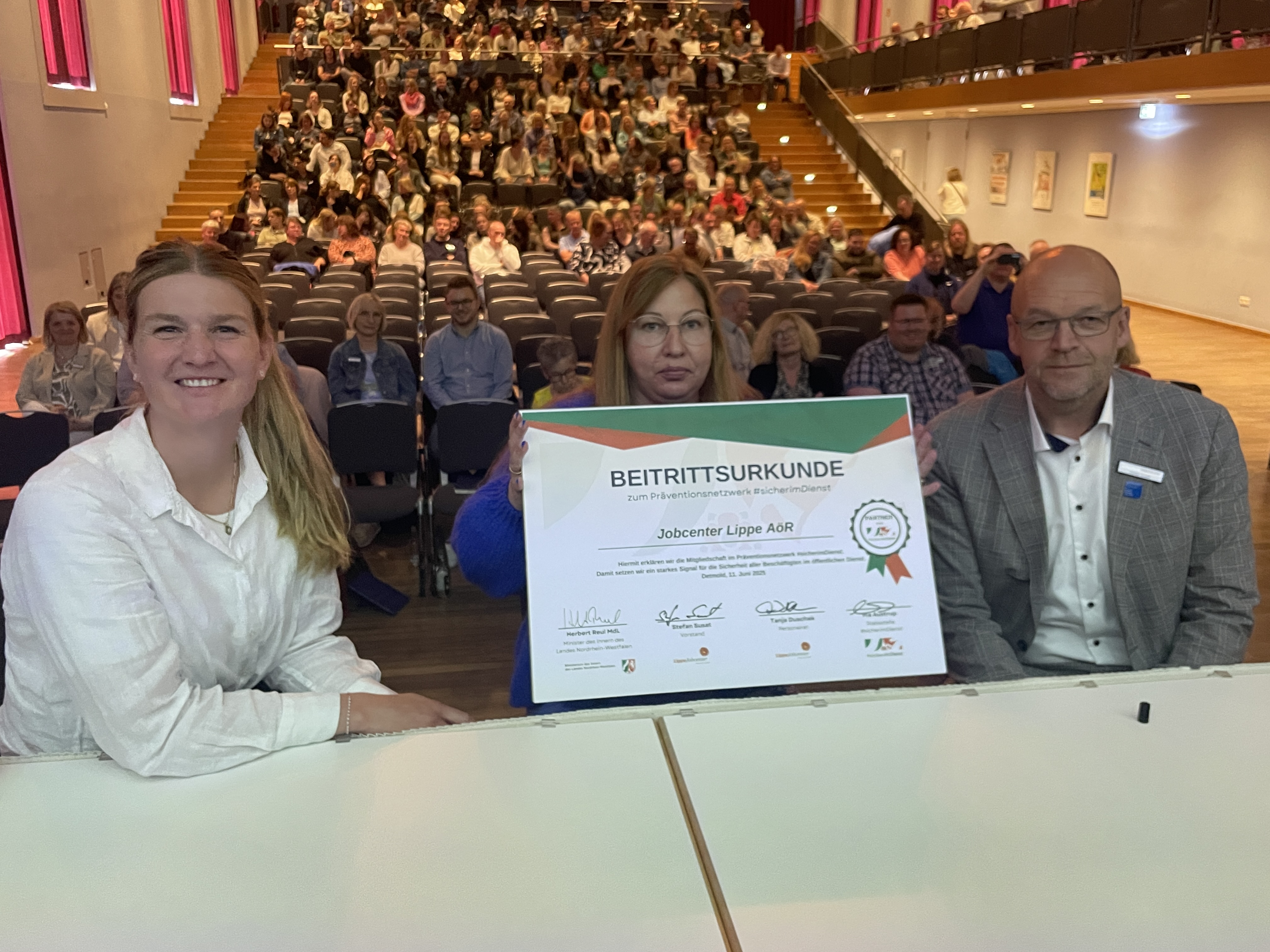 Jobcenter-Vorstand Stefan Susat unterzeichnet im Beisein von Tanja Duschek, stellvertretende Personalratsvorsitzende, und Pia Austrup (links), Stabsstelle „#sicherimDienst“, die Beitrittsurkunde zum Netzwerk. Foto: Jobcenter Lippe