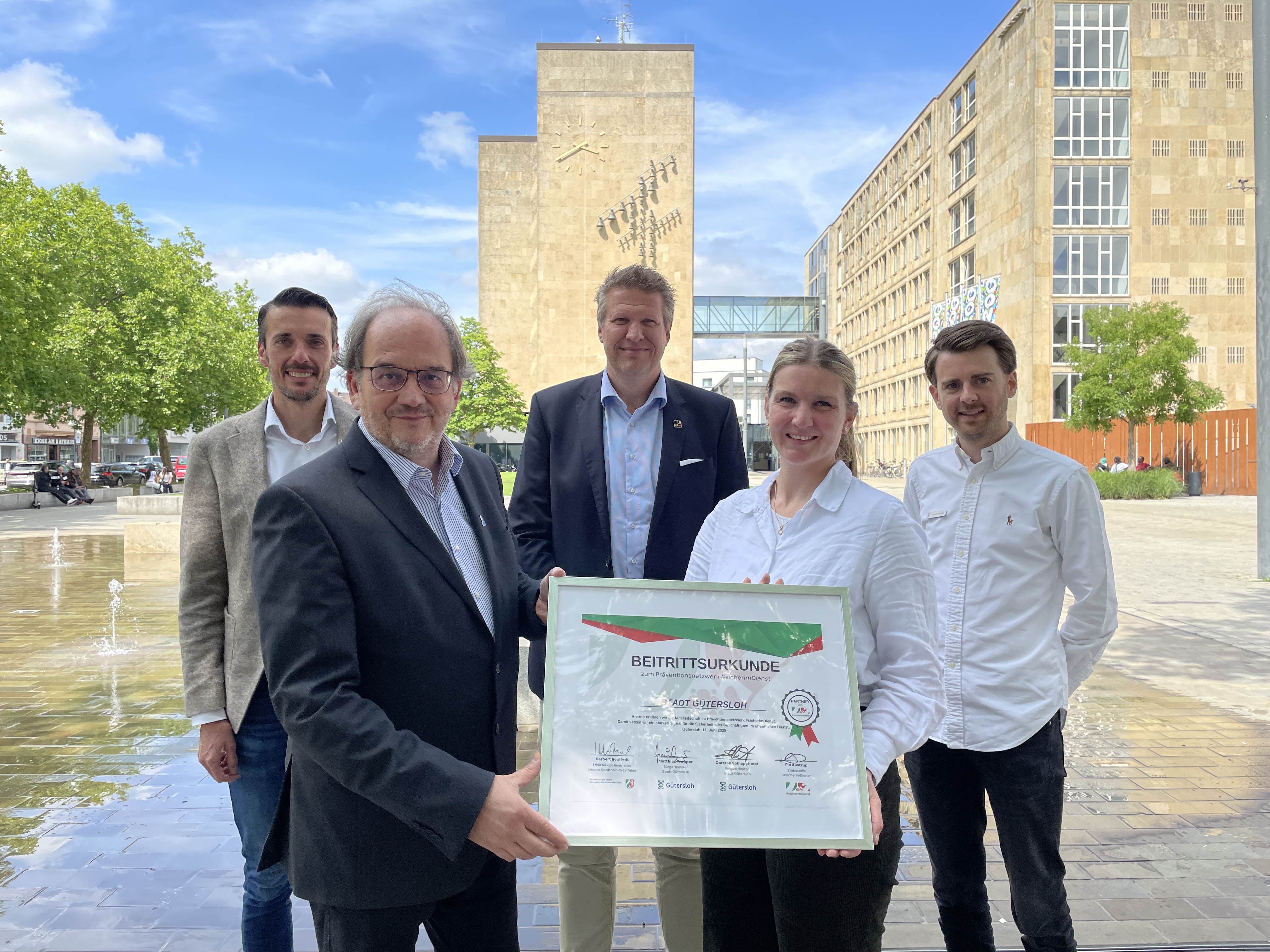 Besiegelten den offiziellen Eintritt in das Präventionsnetzwerk „Sicher im Dienst“ mit der Unterzeichnung der Urkunde: (v.l.) Roman Quenter (Leiter Fachbereich Personal und Organisation), Matthias Trepper (Bürgermeister der Stadt Gütersloh), Carsten Schlepphorst (Beigeordneter für die Bereiche Digitalisierung, IT, Personal, Organisation und Feuerwehr), Pia Austrup (Stabsstelle „Sicher im Dienst“) und Dustin Kramer (Leiter der Abteilung Zentraler Service und Soziale Angelegenheiten).